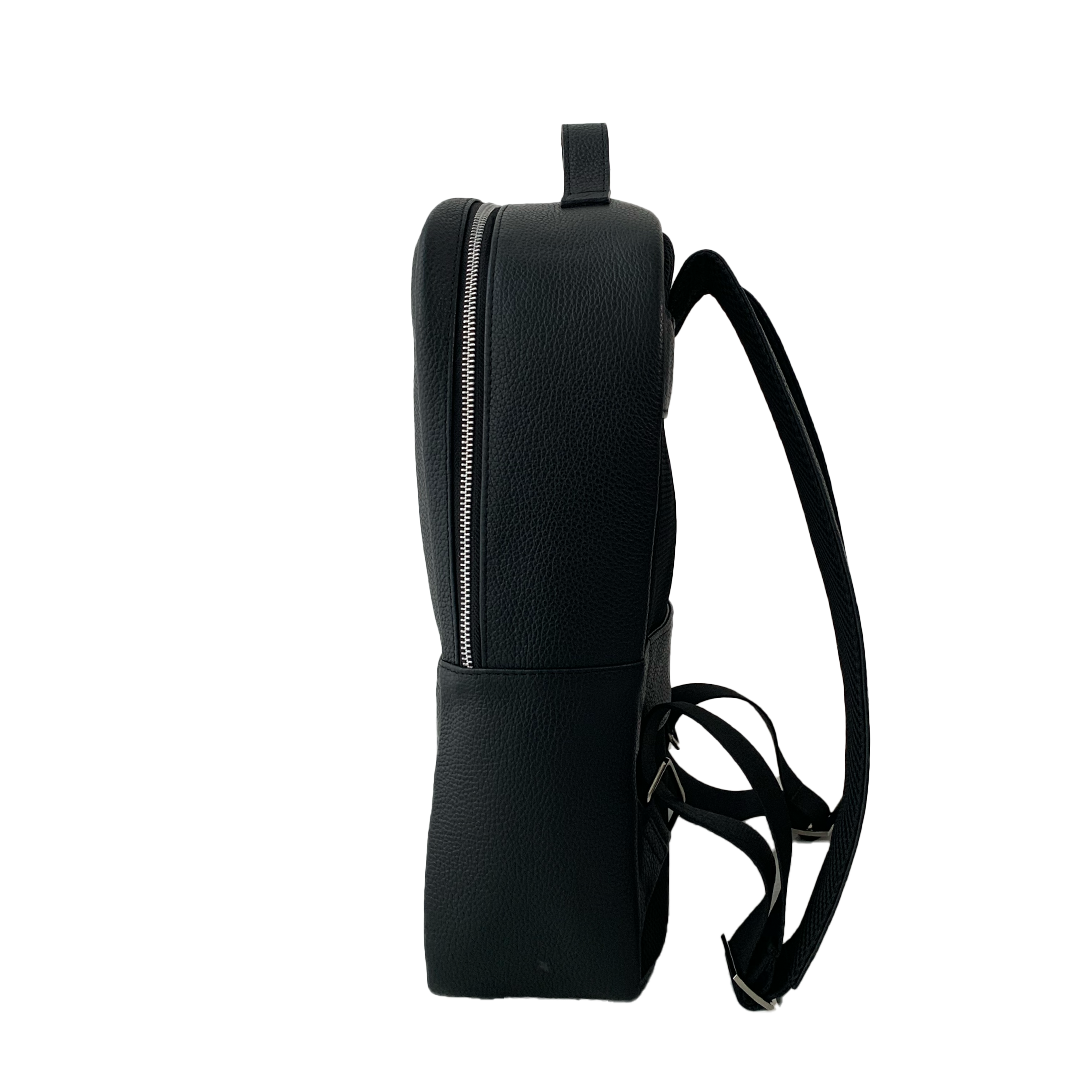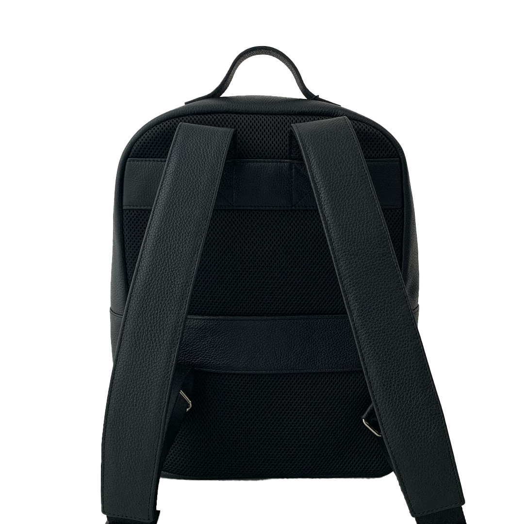 Mochila de cuero graneado con correas de cuero acolchadas y ajustables. Cierres metálicos y tiradores de cuero. Diseño slim con interior forrado en tela de algodón con bolsillo con cierre y dos espacios para llevar billetera y celular. Bolsillo frontal independiente con cierre plástico negro. Ahora viene con sistema de Carry-on parar llevar en equipajes.