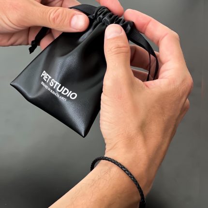 Pulsera de cuero vacuno con chapa metálica en baño negro matte. Conformada por 4 tiras de cuero de diferentes trenzados, unidas por una hebilla metálica de cierre magnético. Viene presentada en una bolsa de PU negra con estampado de PIET STUDIO. Disponible en 3 talles: