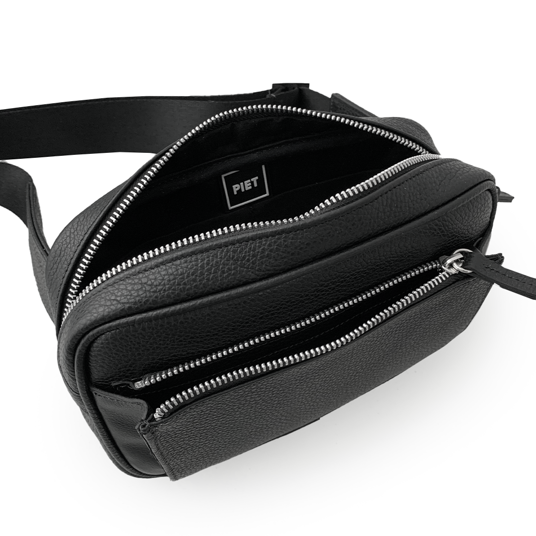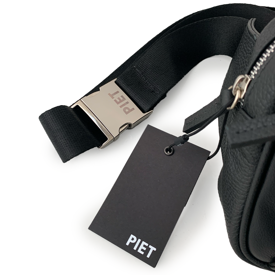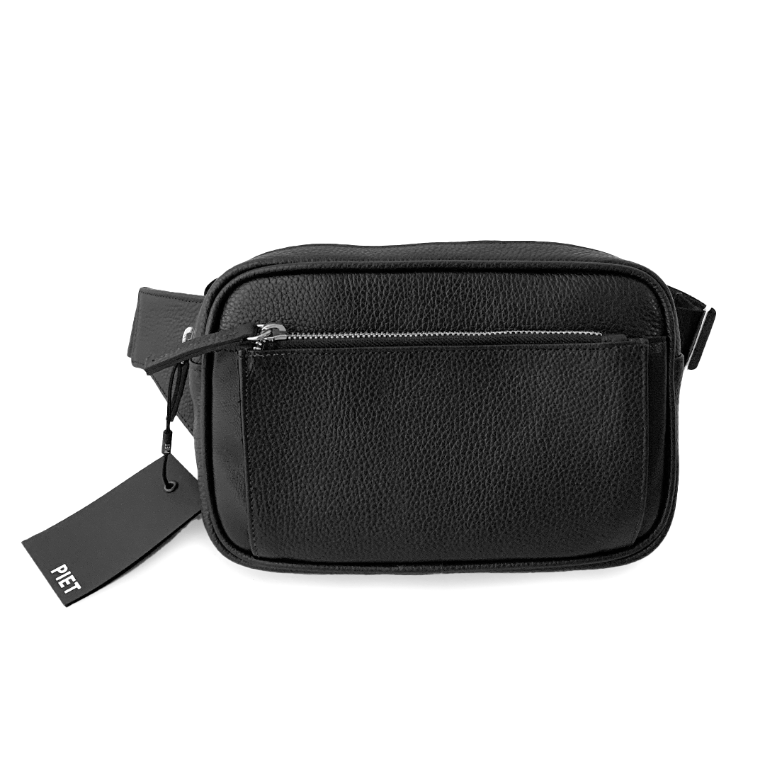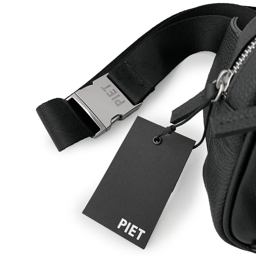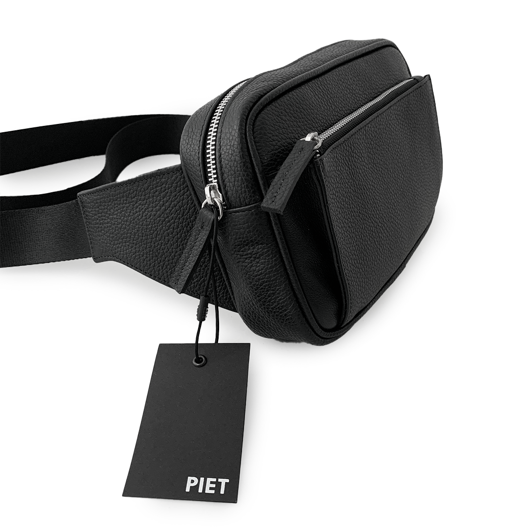 Riñonera realizada en cuero vacuno graneado con revés de tejido mesh. Acceso principal y bolsillo frontal con fuelle de cuero liso y con cierres metálicos. Interior forrado en lona de algodón con bolsillos compartimentados para llevar objetos pequeños. Posee una correa de soga regulable con hebilla metálica negra con logo PIET para llevar cruzado en los hombros.