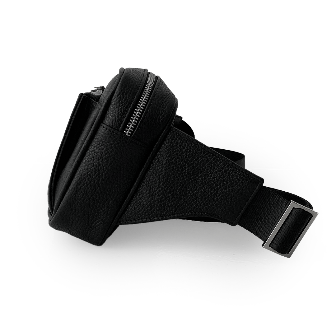 Bolso rectangular compacto tipo riñonera realizado en cuero vacuno graneado. Ideal para llevar cruzado de hombros o en la cintura.