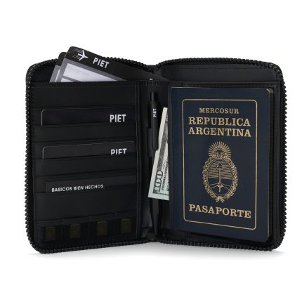 Estuche de cuero vacuno graneado con tapa imantada. En su interior cuenta con un juego de 52 naipes de poker realizados en PVC en Edición total black.