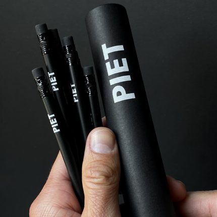 Nueva lapicera tipo bolígrafo de diseño compacto. Realizada en un metal ligero de formato hexagonal y recubierto de esmalte negro satinado y con el detalle del logo PIET en blanco serigrafiado sobre el clip. Cuenta con un mecanismo accionado por pulsador. La puntera es con bolilla metálica de trazo medio (1.0 mm) y de tinta color negro.